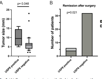 在关键的基因型-表型关联分析中,USP8突变阳性的CD患者展现出显著差异:肿瘤体积更大(9.5mm vs 6.0mm,p=0.048),海绵窦侵犯倾向更高(50% vs 12.5%,p=0.06),术后未缓解风险增加(33.3% vs 0%,p=0.021)。