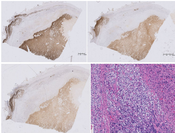 肿瘤组织HE染色显示广泛出血性坏死,免疫组化符合嗜铬细胞瘤