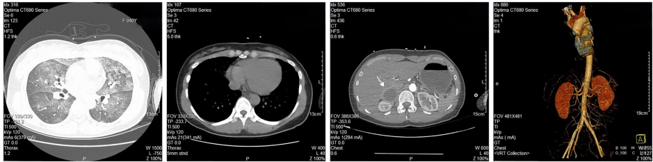 胸部CT显示双肺渗出性改变及右肾上腺低密度影
