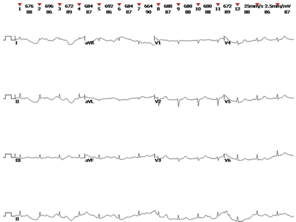 心电图显示窦性心动过速(105次/分)伴胸导联ST段压低