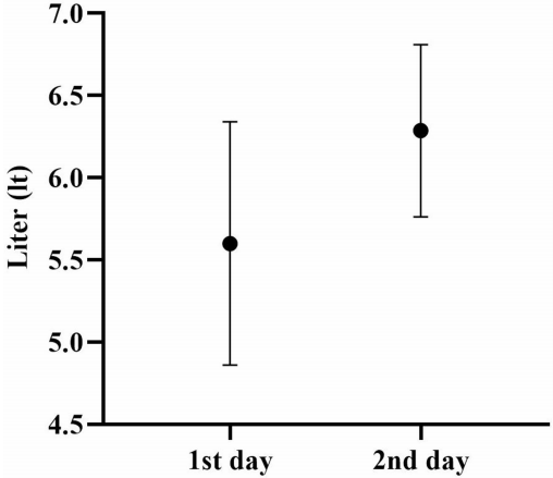 数据显示第二日补水量(3.1±0.5L)显著高于第一日(2.5±0.4L)(p=0.003),但与USG改善无相关性(r=-0.09)。这表明单纯增加补水量无法逆转定向运动特有的脱水趋势。