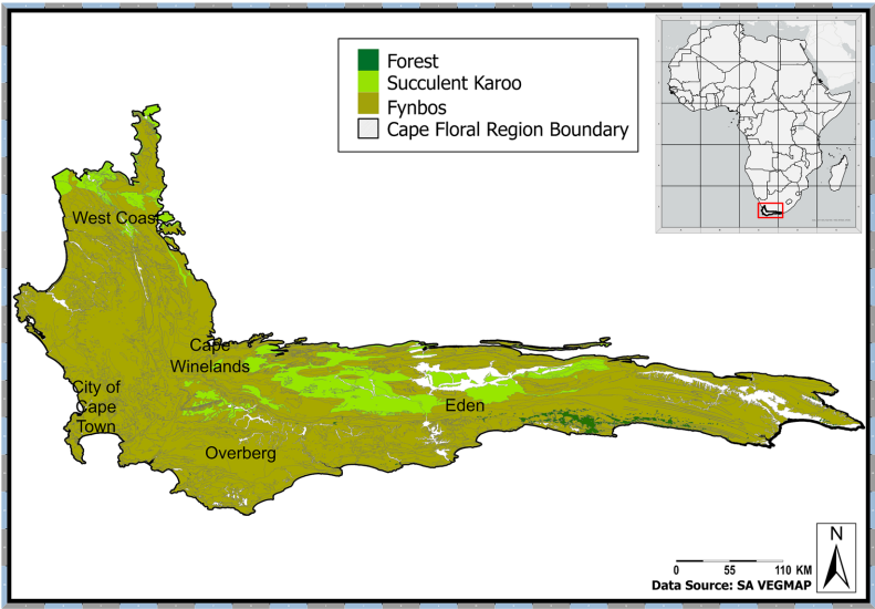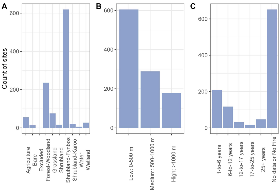 【Study area】研究区域聚焦GCFR三大生物群落:以灌木为主的Fynbos生物群落(火干扰周期7-25年)、Succulent Karoo干旱群落和AfroTemperate森林。研究通过
