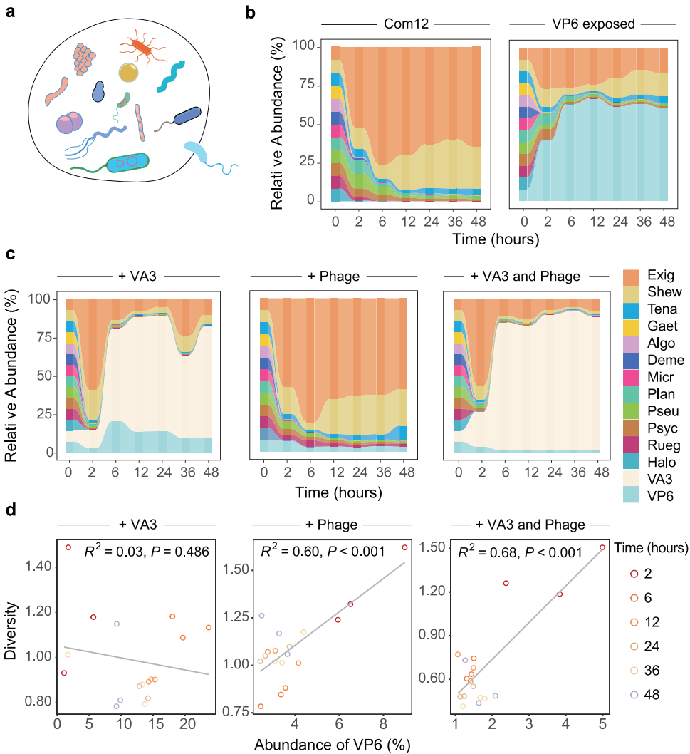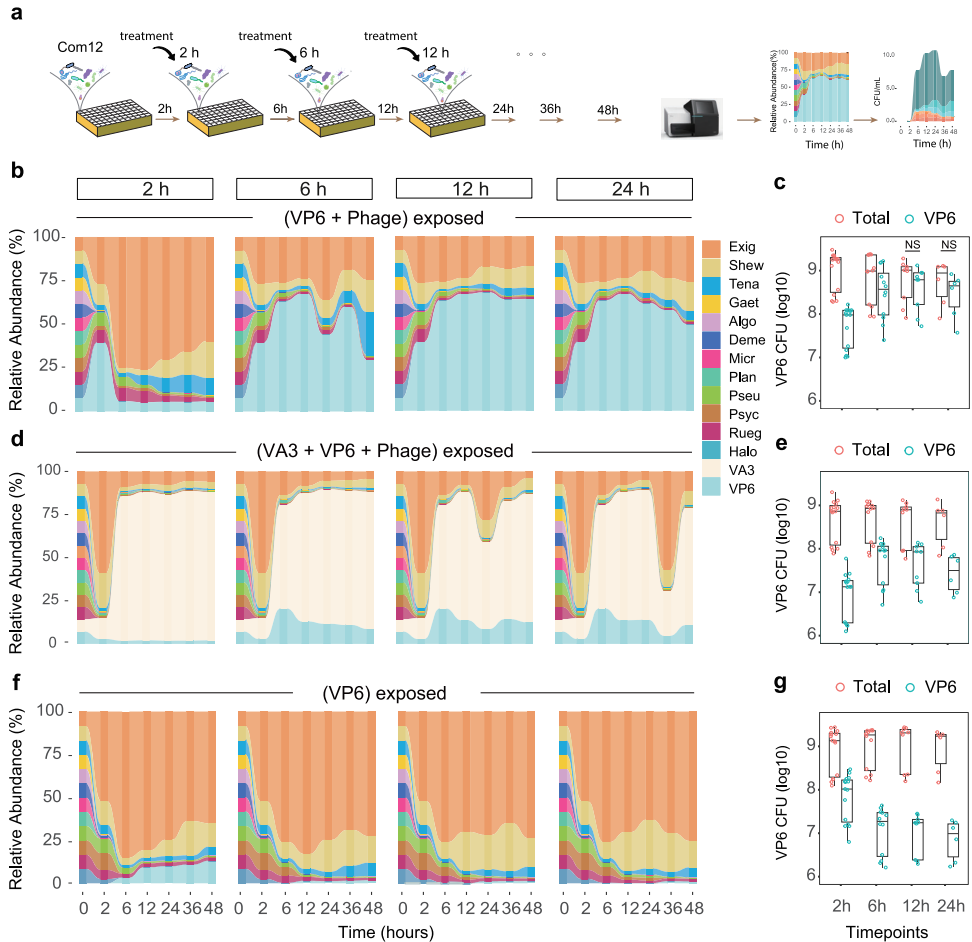 共培养实验揭示关键时间窗口:当VP6在Com12建立2小时后入侵,其增殖会被不可逆抑制(<1×105 CFU/mL);而延迟6小时添加噬菌体则使抑制效果降低50%。VA3与噬菌体联用可突破时间限制,即使延迟干预仍能使VP6相对丰度<1%。菌群多样性分析显示噬菌体处理与Shannon指数呈正相关(R2=0.60),表明其具有生态稳定性调控功能。