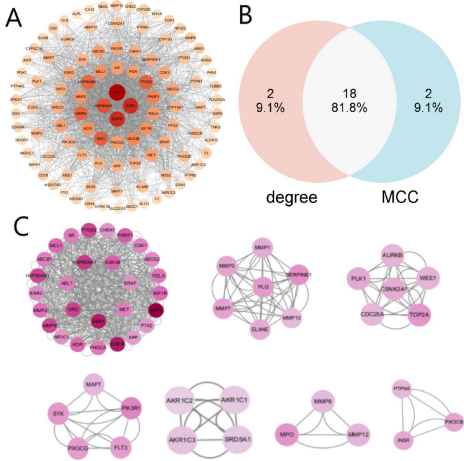 PPI网络显示104个节点和1886条相互作用边。通过CytoHubba筛选出18个核心靶点,包括ESR1、AKT1、EGFR等。MCODE聚类分析识别出7个重要功能模块。