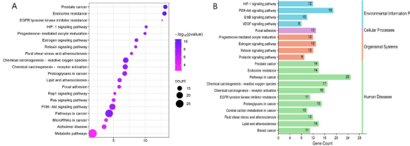 GO分析显示靶点显著富集于蛋白磷酸化(BP)、ATP结合(MF)等过程。KEGG分析揭示PI3K-AKT、HIF-1等20条关键通路,其中ESR介导信号通路P值达3.89E-15。