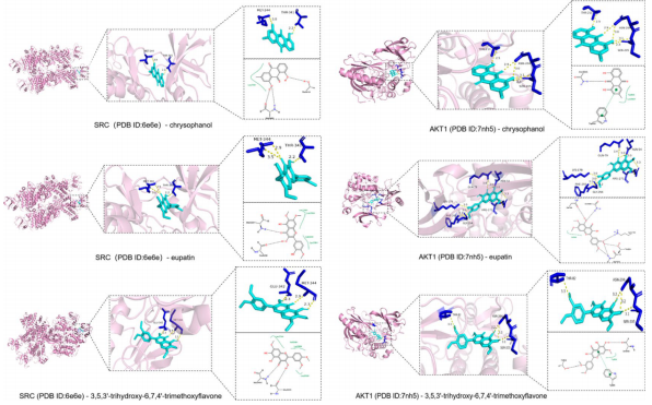 该研究首次系统揭示大黄通过多成分协同调控ESR1、AKT1等靶点,干预PI3K-AKT和ESR介导信号通路治疗宫颈癌的分子机制。特别发现大黄酚与AKT1的强结合活性,为ESR信号通路与PI3K/AKT串话(crosstalk)在宫颈癌治疗中的作用提供新证据。尽管存在分子对接静态分析的局限性,但该研究为中药现代化研究提供范式,也为开发抗宫颈癌中药复方奠定理论基础。未来需通过分子动力学模拟和体内外实验进一步验证,推动中药抗肿瘤研究的临床转化。