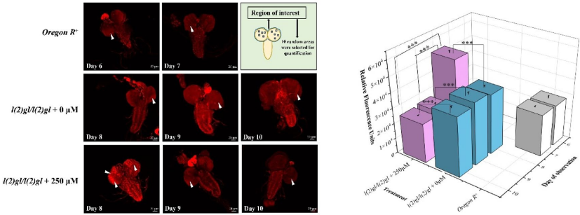 剂量实验显示250μM DHA使突变体脑体积从157×103μm2恢复至野生型水平(102×103μm2),翅盘结构同步修复。更突破性的是,该剂量使97%幼虫完成蛹化,75%成功羽化为成虫,这是首次在该模型中实现发育全程挽救。
