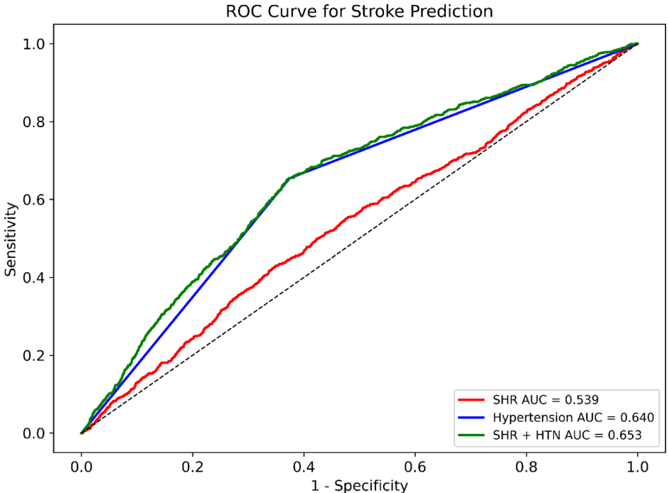 ROC曲线显示,单纯SHR模型预测效能有限(AUC=0.539),但与高血压联合后显著提升(AUC=0.653)。
