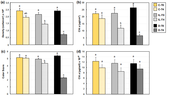 完全黑暗处理导致珊瑚遭遇"能量雪崩":虫黄藻密度锐减70%,叶绿素a含量下降75%,色卡评分从5分(健康)暴跌至2分(严重白化)。相比之下,间歇性光照组仅出现轻度组织褪色(色卡评分降1分),虫黄藻密度和叶绿素a分别减少32%和47%。值得注意的是,单位虫黄藻细胞的叶绿素a含量在所有处理中保持稳定,暗示珊瑚可能通过调控共生藻数量而非单个藻细胞色素浓度来适应光限制。