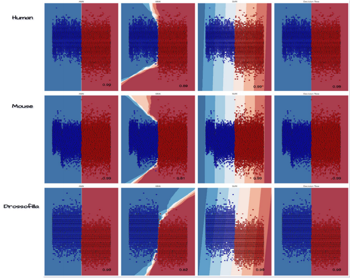 研究结果展现出令人振奋的性能表现。在人类数据集上,Stacking集成模型在独立测试中取得ACC=0.99、MCC=0.99的完美成绩,敏感性(Sn)和特异性(Sp)均达99%。值得注意的是,该模型对果蝇数据的预测同样出色(AUC=0.99),且在小鼠数据集上保持98%的准确率,证明其跨物种适用性。通过决策边界可视化分析发现,TranspoPred能清晰区分piRNA与非piRNA的序列特征空间,这解释了其超高精度的内在机制。