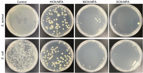 菌落计数显示SCN:MFA对E. coli和S. aureus抑制率分别达99.3±2.89%和98.3±1.69%,研究者认为磺酸基团的正电荷增强了与细菌膜的静电作用,而纳米纤维的小尺寸促进了活性氧(ROS)生成。