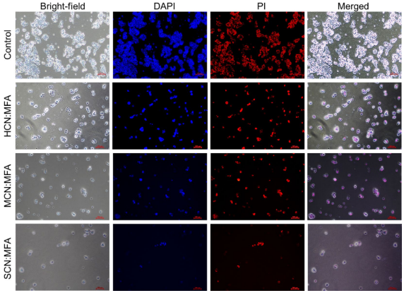WST实验显示SCN:MFA对HCT-116细胞的IC50低至7.51±2.33 μg/mL,DAPI/PI双染色证实其通过诱导细胞凋亡发挥作用。分子对接揭示SCN的硫原子与癌细胞表面特异性结合,增强靶向性。