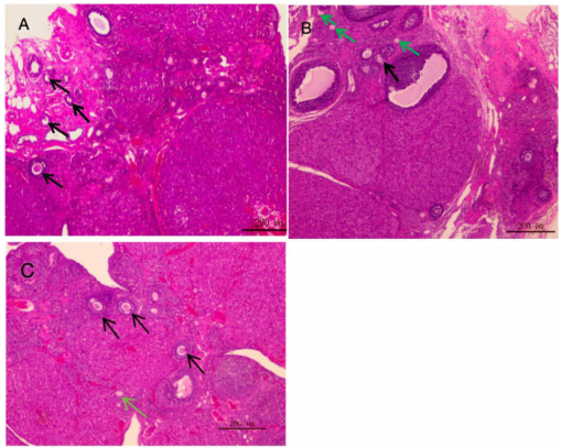 研究团队采用经典的SD大鼠模型,通过腹腔注射阿霉素(10 mg/kg)建立卵巢损伤模型,并创新性地引入AS101(3 mg/kg)进行干预。实验设计包含三组对比:空白对照组(A组)、单纯阿霉素组(B组)以及阿霉素+AS101组(C组)。研究过程中,团队系统监测了大鼠体重变化、动情周期规律性,并采用ELISA检测血清激素水平(E2、FSH、AMH)和氧化应激指标(SOD、MDA、ROS)。通过HE染色对卵巢组织进行形态学分析,定量统计原始卵泡和闭锁卵泡数量。