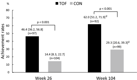 体重与代谢改善:研究最引人注目的发现是托格列净显著的减重效果。如图2所示,治疗组在26周时就展现出3倍于对照组的减重达标率,且随时间推移优势持续扩大。值得注意的是,伴随体重下降,腰围显著减小,提示内脏脂肪减少。这种体成分改善带来多重代谢获益:HbA1c降低0.8%、收缩压下降5.2mmHg、高密度脂蛋白胆固醇(HDL-C)升高3.1mg/dL,且肝酶(AST/ALT/yGTP)水平显著改善。