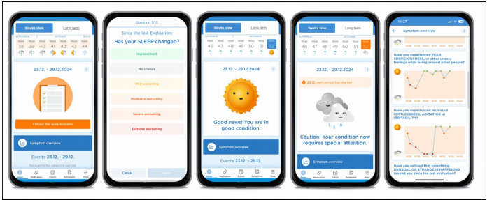 研究采用多中心随机对照设计,在德国8家医疗机构招募110例门诊患者。核心技术创新在于:1) 基于EWSQ-10P量表的动态监测算法;2) 采用气象图标直观显示症状变化的可视化界面;3) 医生端数字仪表板(digital clinic portal)实时追踪风险;4) 触发阈值自动启动的强化监测模式。主要终点是比较干预组与常规治疗组(TAU)的12个月再住院率。