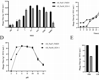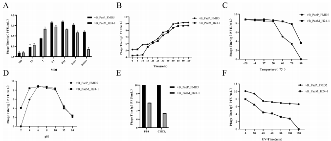 FMD5和H24-1的最适感染复数(MOI)分别为0.01和0.1,爆发量达200 PFU/细胞和150 PFU/细胞。两者在pH4-10和≤50℃条件下保持稳定,且能耐受氯仿和紫外线处理,表明具备临床应用所需的环境适应性。