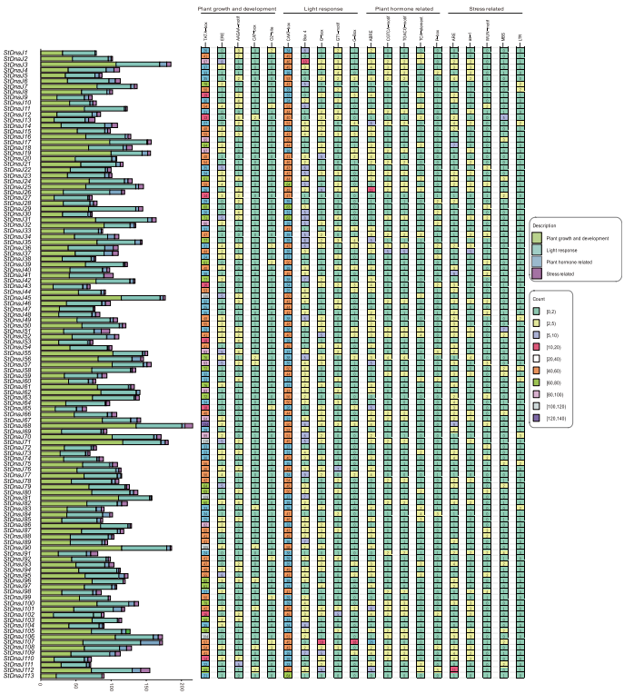 2000 bp启动子区预测发现202个顺式元件,77%成员含ABA响应元件ABRE,66.3%含茉莉酸响应元件CGTCA/TGACG,78.8%含厌氧响应元件ARE。StDnaJ107启动子含ABRE数量最多,与其强诱导表达相关。