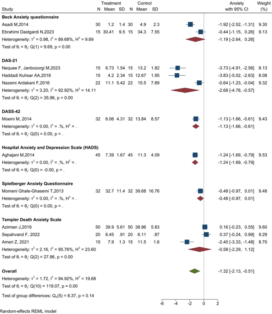 焦虑改善:11项研究显示干预组焦虑显著降低(SMD:-1.32),但异质性高(I2=94.9%)。