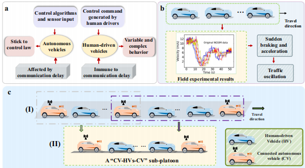 随着自动驾驶技术快速发展,SAE Level 5级自动驾驶车辆预计将在205年占据10%-71%的行驶里程。然而在未来几十年内,自动驾驶车辆与传统人类驾驶车辆混行的交通环境将成为常态。这种混合交通模式面临两大核心挑战:人类驾驶行为的随机性和异质性,以及车联网通信中不可避免的延迟问题。现有研究多聚焦单一类型车辆队列控制,难以应对混流交通中人类驾驶车辆突然加减速引发的交通振荡(如图1b所示),更无法有效解决V2X通信中随机延迟对控制性能的影响。