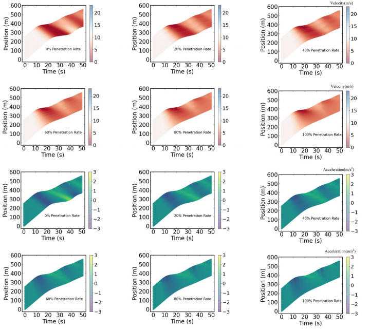 当CAV渗透率从0%提升至100%时,交通流稳定性fflow提高8.7%(表1)。热力图显示(图7),纯人类驾驶队列会出现速度归零的交通阻塞,而混合队列能有效抑制振荡传播。