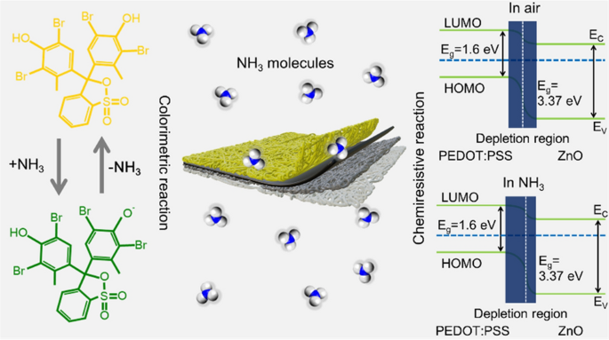 氨(NH3)是全球产量第二大的化学品,具有众多的工业应用。然而,这些应用存在显著的风险,例如氨泄漏或在密闭环境中导致的中毒事件已造成人员伤亡。这凸显了开发高度便携且易于使用的可穿戴氨传感器的迫切需求。化学电阻式传感器因其结构简单、灵敏度高和响应时间短而广泛应用于可穿戴设备中,但由于湿度、高温以及干扰气体的影响,这些传感器容易出现故障或检测不准确的问题。为了解决这些问题,研究人员开发了一种基于聚合物纳米纤维的气体传感平台,该平台具有良好的灵活性,并促进了氨在比色(基于溴甲酚绿)和化学电阻(基于聚(3,4-乙烯二氧噻吩):聚(苯乙烯磺酸盐))传感层之间的高效传输。这种双模式设计使得氨的检测更加可靠。每个单独层的氨检测性能都与双模式气体传感平台相当,即使在附着在人体皮肤上或处于潮湿环境中也能有效工作。因此,本研究开发出了一种性能稳定、选择性强且可重复使用的氨传感器,为多种应用提供了新的解决方案,并引入了一种创新的传感器工程范式。