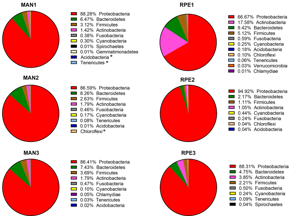 研究共鉴定出16个菌门、112个菌属,其中Proteobacteria在两地种群中均占绝对优势(MAN 87.22%,RPE 84.68%),其次为Bacteroidetes、Actinobacteria和Firmicutes。MAN种群展现出更高的菌群丰富度(84 vs 79个菌属),且特有菌属达31个。