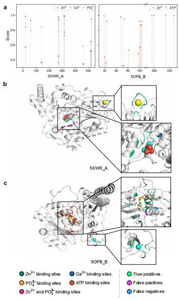 在包含474种未见配体的DS3测试集上,LABind的MCC(0.510)显著优于LigBind(0.379),特别是对Zn2+等金属离子的预测精度提升34.4%。如图1所示,模型能准确区分5XWK_A蛋白中Zn2+与PO43-的重叠位点和Ca2+的独立位点。