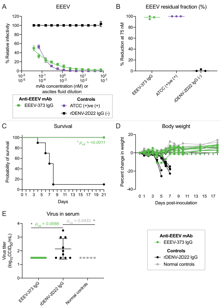 在小鼠模型中,10mg/kg剂量可实现100%存活率(对照组仅10%),血清病毒载量降至检测限以下,体重保持稳定,显著优于登革病毒对照抗体rDENV-2D22。