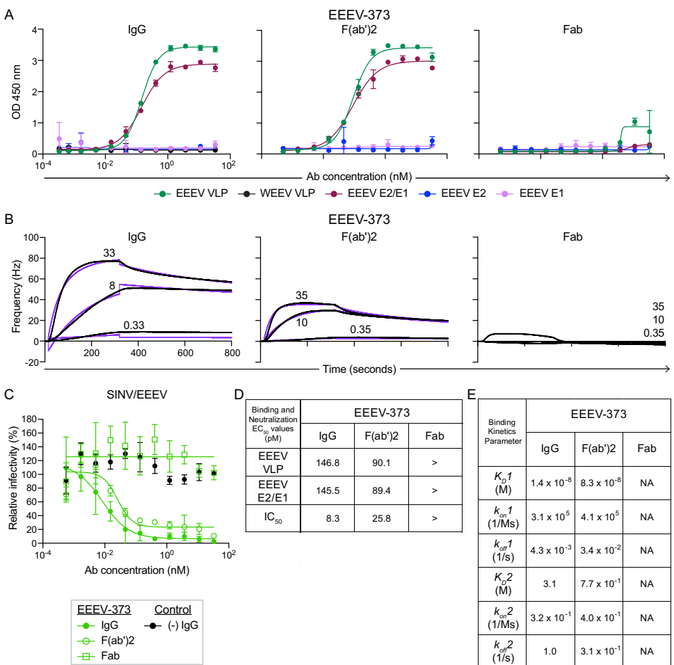 ELISA和动力学分析显示EEEV-373 IgG和F(ab')2的KD为4nM,而单价Fab几乎无结合能力(KD>100nM)。中和实验证实IgG(IC50<37pM)和F(ab')2保持活性,但Fab完全丧失中和能力,表明双价结合产生的亲合力效应至关重要。