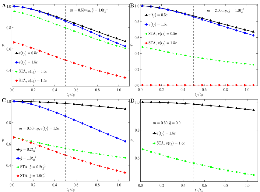 在tB=ξ/√2c时间尺度下,轻杂质(m=0.25mB)在强耦合(g?=1.0tB-1)时仍保持95%传输效率(图2B),且最优加速度曲线呈现非线性脉冲特征(图2D插图)。