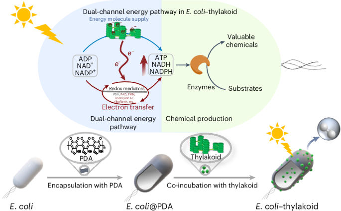 《Nature Synthesis》:Dual-channel energy pathway combining energy molecule supply and electron transfer to support solar-to-chemical production in an E. coli–thylakoid hybrid