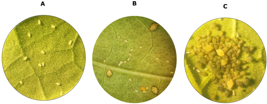 研究通过三阶段验证体系:初筛(单株无重复)→验证(2-10株重复)→自交系确认。采用标准化温室条件(25/23°C,16h光照),使用夹笼法接种同步化害虫,分别在第5天(粉虱)和第9天(蚜虫)统计生存/繁殖指标。对PI 550694等关键材料进行27天持续观察,计算幼虫转化率(LR)和成虫羽化率(AR)。