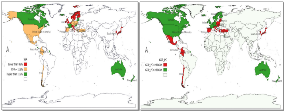 通过双指标(SSR和人均GDP)将OECD国家划分为六类,其中两类最具代表性:1.2类(高GDP低SSR)包含瑞士、英国等10个富裕欧洲国家;2.1类(中等GDP中等SSR)包含希腊、墨西哥等9国。值得注意的是,美洲国家无论经济水平都表现出较高的SSR值,这与欧洲国家形成鲜明对比。