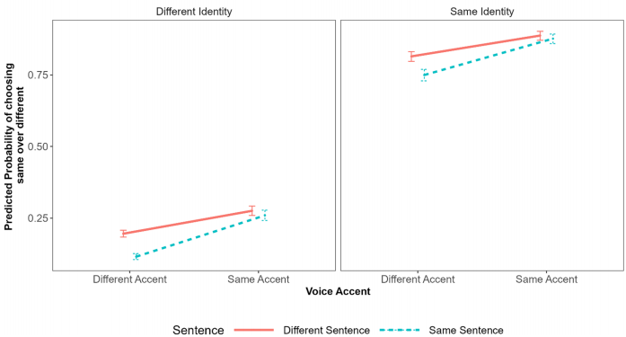 如图1所示,口音差异独立产生10%的识别偏差。当不同身份者使用相同口音时,受试者更易误判为同一人(p<0.001),印证"单口音预期"假说。