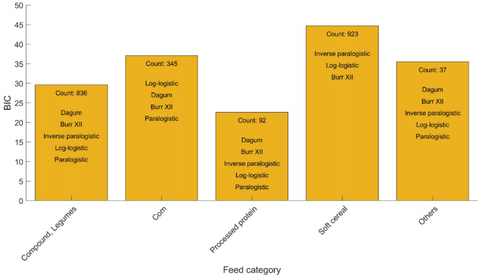 图4决策树分析显示,模型类型对BIC的影响权重达65.2%,远超饲料类别的34.8%。特别值得注意的是,在加工蛋白饲料中,优选模型的RPI高达94.2%,意味着其误差减少效果接近翻倍。研究还发现传统Cauchy、Gumbel模型在多类饲料中表现显著较差(P<0.01),这颠覆了既往认为复杂模型必然更优的认知。