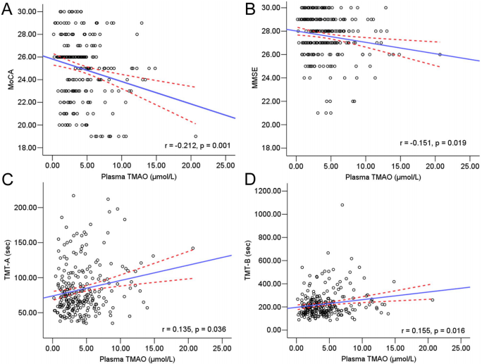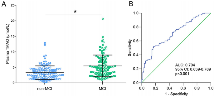 研究结果显示,MCI患者血浆TMAO中位数达4.88 μmol/L,显著高于健康对照组的2.87 μmol/L。受试者工作特征(ROC)曲线分析显示,TMAO区分MCI的曲线下面积(AUC)为0.704,最佳截断值4.74 μmol/L时特异性达82.8%。多因素校正后,TMAO最高四分位数组的MCI风险是最低组的6.95倍。值得注意的是,TMAO水平与MoCA评分呈显著负相关,这种关联独立于年龄、心血管危险因素等混杂变量。