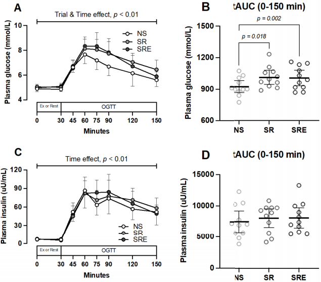 为解决睡眠不足对代谢健康的影响问题,Che-Wei Hsu团队开展了一项随机交叉研究,探究单夜3小时睡眠限制(SR)及后续30分钟中等强度步行(50%VO2max)对健康男性口服葡萄糖耐量试验(OGTT)的影响。结果显示,睡眠限制显著升高葡萄糖曲线下面积(tAUC),而步行干预未能改善这一损害,提示急性运动需更高强度才能抵消睡眠不足的代谢负面影响。
