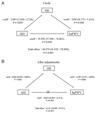 校正年龄、性别、BMI等混杂因素后,AHI对baPWV的影响完全通过HR介导(间接效应P<0.001),直接效应消失(P=0.883)。这表明OSA主要通过升高心率而非其他途径加剧动脉硬化。
