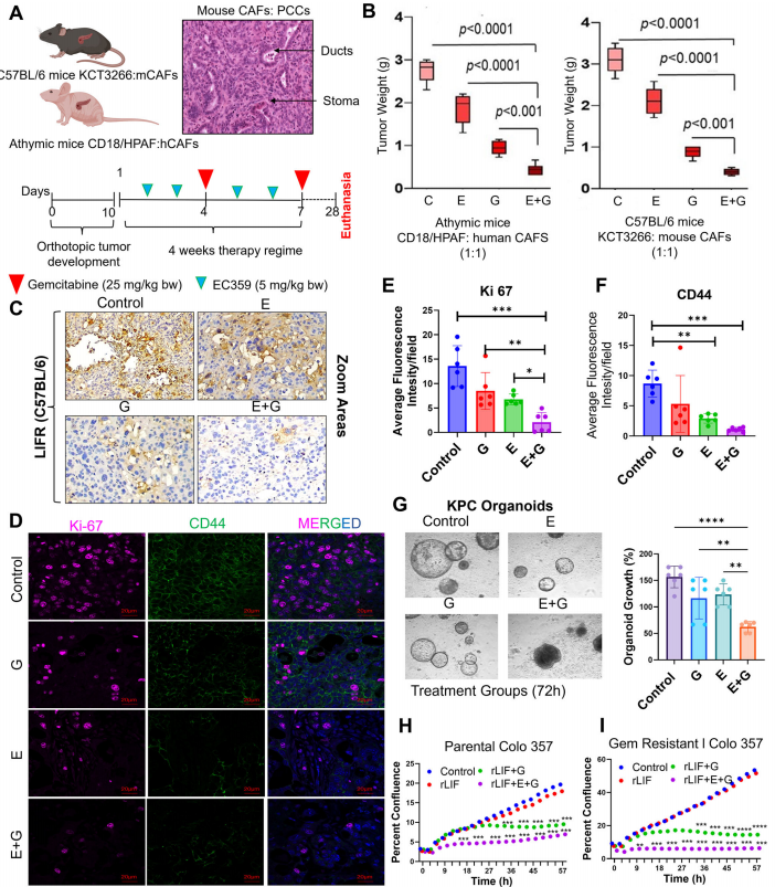在CAFs与PDAC细胞(1:1)共植入模型中,EC359(5mg/kg)联合吉西他滨使肿瘤负荷降低55%(相比单药)和90%(相比对照)。机制上: