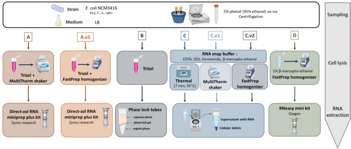 该研究发表在《Scientific Reports》上,主要采用了四种RNA提取方案对比:Trizol温和震荡裂解(Protocol A)、Trizol相分离(Protocol B)、热裂解RNA snap法(Protocol C)和机械裂解柱纯化法(Protocol D)。通过琼脂糖凝胶电泳定量分析rRNA含量,结合RT-qPCR测定多种mRNA半衰期,研究人员系统评估了不同方法对RNA稳定性测量的影响。