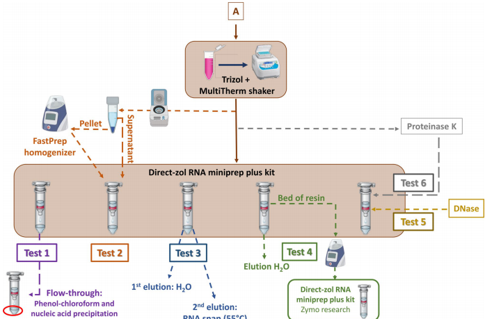 系列追踪实验排除了rRNA通过柱流失(Test 1)、被细胞碎片捕获(Test 2)或被DNA/蛋白复合物束缚(Tests 5-6)的可能性。Test 3发现柱二次洗脱可回收部分核酸复合物,但不足以解释全部rRNA丢失。