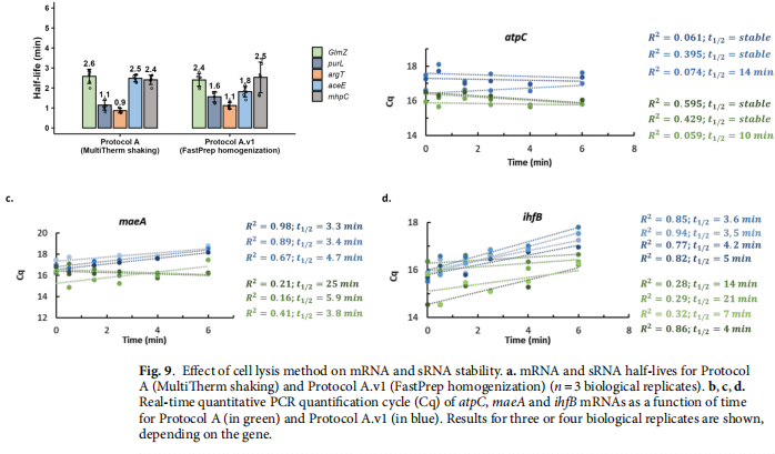tRNA在所有方案中均保持稳定。mRNA半衰期测定显示,强力裂解可获得稳定数据(如maeA mRNA半衰期约4.0分钟),而温和裂解导致部分mRNA(如ihfB)降解曲线不可靠(R2<0.5)。