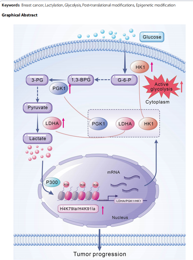 该研究首次阐明组蛋白H4K79la和H4K91la通过激活糖酵解基因转录,形成"乳酸产生-组蛋白乳酸化-糖酵解基因激活"的正反馈环路,推动乳腺癌进展。发现P300作为乳酸转移酶调控此过程,为靶向代谢-表观遗传交叉调控的乳腺癌治疗提供新策略。修饰组学鉴定的5495个乳酸化位点,为后续研究开辟了广阔方向。