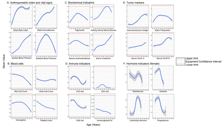 衰老轨迹:发现腰围、收缩压等指标随年龄单调上升,而CD4+细胞计数在70-90岁接近正常下限。