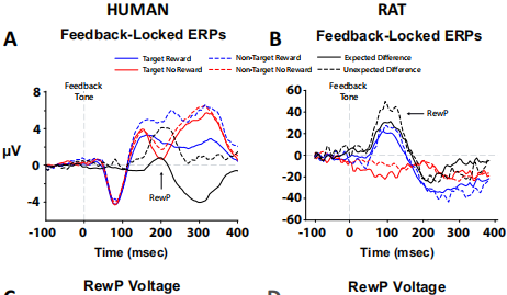 本研究通过人类与大鼠的概率逆转学习(PRL)任务,首次系统比较了认知灵活性的行为、神经生理和计算标记。研究发现前额叶奖赏正波(RewP)与预期误差(PE)显著相关,且多巴胺激动剂莫达非尼(modafinil)能改变大鼠PE值。该成果为开发靶向认知灵活性缺陷的神经精神疾病治疗提供了跨物种研究范式。