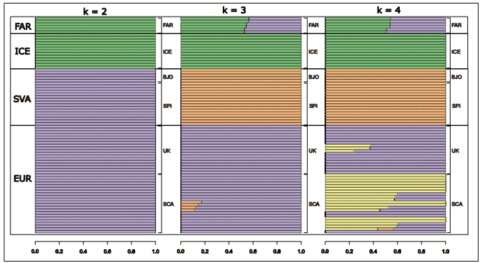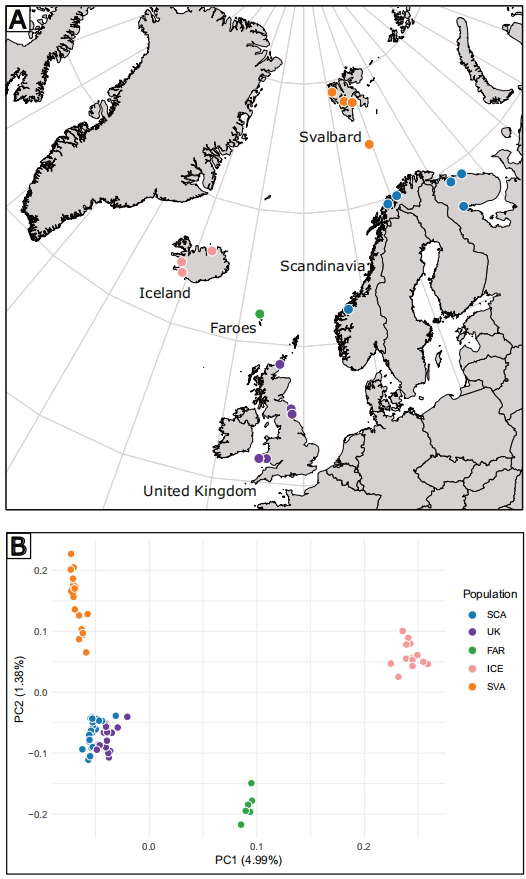 群体结构分析揭示了令人惊讶的地理格局。主成分分析(PCA)和群体遗传结构分析均表明,斯瓦尔巴群岛(SPI)和比约恩岛(BJO)的个体形成了独立的遗传群体(SVA),与欧洲大陆群体(EUR)明显分化,而冰岛(ICE)和法罗群岛(FAR)群体则呈现中间状态。这种显著的地理结构与该物种高度扩散的生活史特征形成鲜明对比。