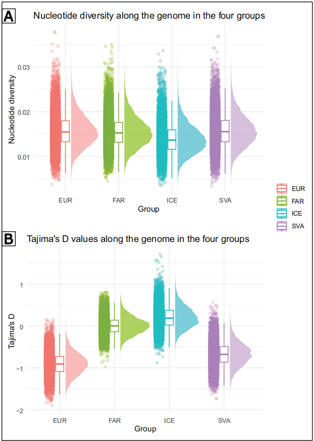 群体遗传学指标进一步支持了早期殖民假说。斯瓦尔巴群体(SVA)和欧洲群体(EUR)表现出相似的核苷酸多样性水平,但均呈现负值的Tajima's D,暗示历史上可能经历过种群扩张。相比之下,冰岛群体(ICE)的遗传多样性略低,Tajima's D接近中性预期。这些模式与近期快速殖民导致的遗传瓶颈预期不符,反而支持了长期稳定存在的种群历史。