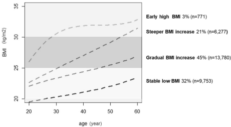 通过分析20-70岁间的体重变化,识别出:稳定低BMI组(32%)、渐进增重组(45%)、陡增BMI组(21%)和早期高BMI组(3%)。
