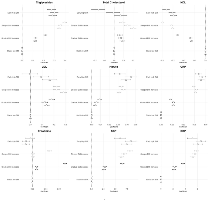 研究采用三大关键技术:1)潜在类别增长模型(LCGM)分析BMI纵向轨迹,基于贝叶斯信息准则确定最佳分组;2)标准化采集空腹血糖(HbA1c)、血脂(包括LDL/HDL)、炎症指标(CRP)等9项心血管代谢标志物;3)多变量线性/逻辑回归模型调整年龄、性别、吸烟等混杂因素,并分层分析降压/降脂药物使用的影响。