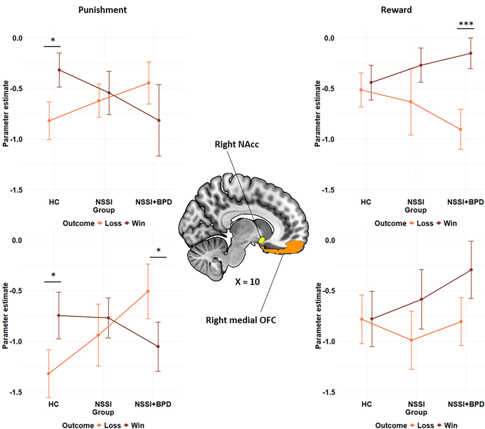 ROI分析发现更精细的神经编码模式:在惩罚条件下,健康组的右侧NAcc和mOFC对"避免负面评论"(赢)的激活显著高于"接收负面评论"(输),而NSSI+BPD组呈现完全相反的模式,单纯NSSI组则处于过渡状态。这种反转现象提示:临床患者可能反常地从负面社交反馈中获得神经强化,这为理解其"自我挫败行为"提供了新视角。
